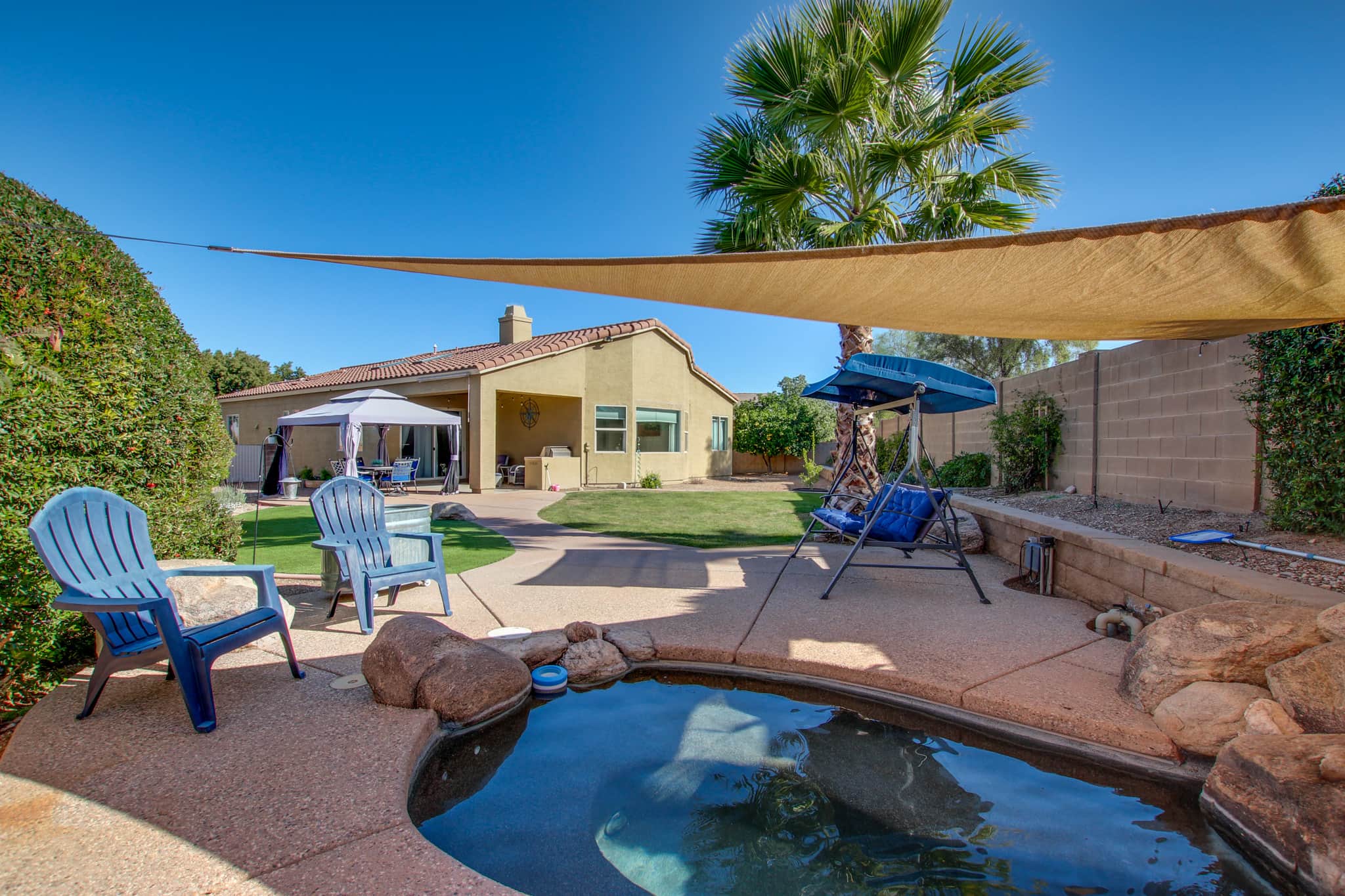 Hermosa Del Sol is 3 bedroom, 2 bathroom home that offers everything and then some when traveling. Beautiful kitchen with granite countertops, wine fridge and extended counter/cabinet space in dining area.The fully landscaped backyard oasis which features a built-in BBQ, mature citrus trees, and a spacious spool with rock waterfall feature! Plenty of room for entertaining and relaxing.
